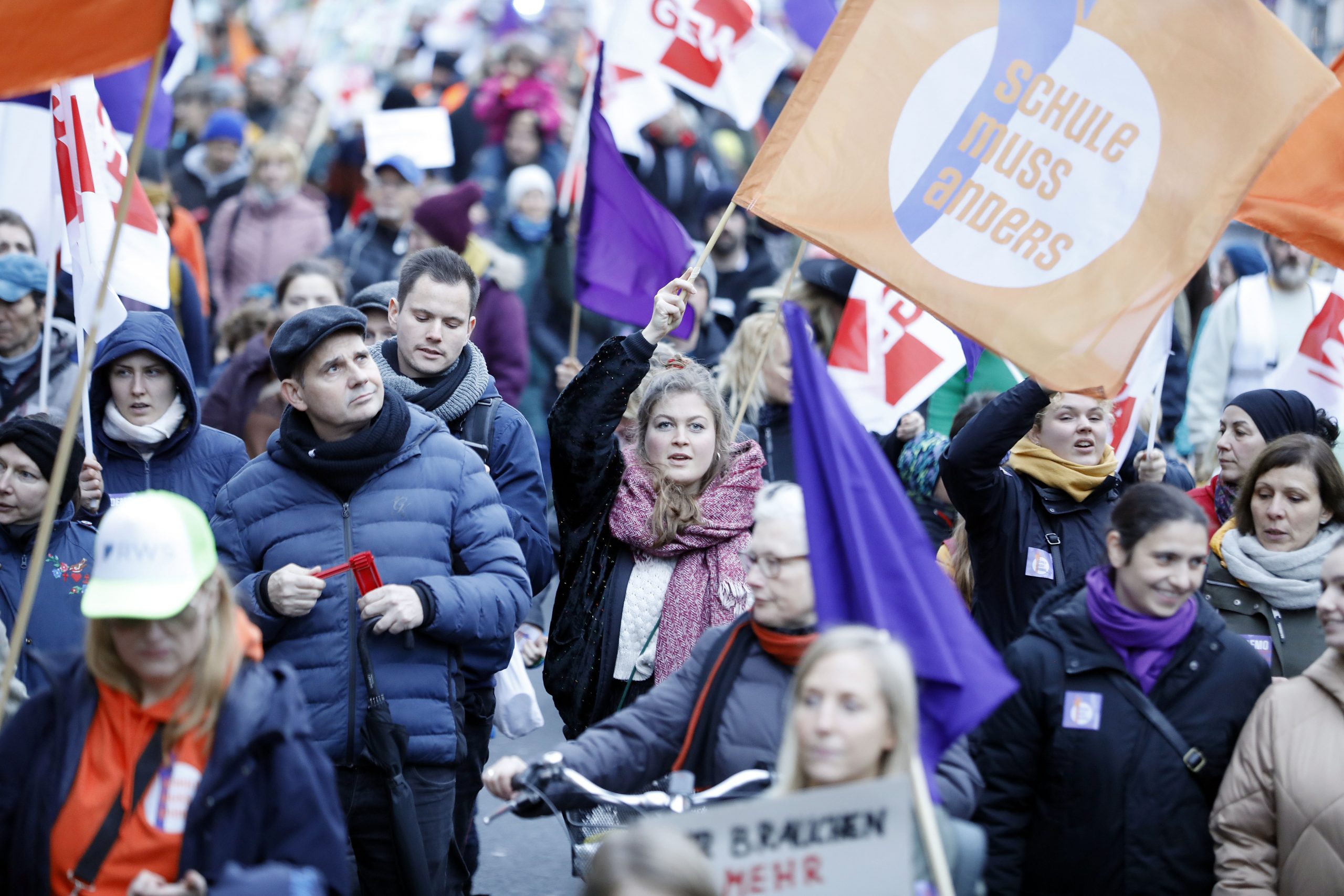 Da 14 Uhr für einige zu früh ist, stoß einfach später bei einer Zwischenkundgebung dazu. Den Bildungsblock erkennst du u.a. am lilafarbenen „Schule muss anders“-Banner und den GEW-Fahnen.